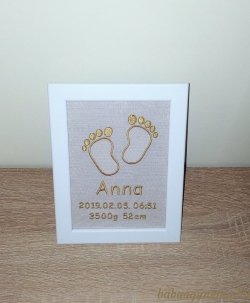"Megérkeztem..." fatábla és hímzett keretes kép, mely a kisgyermek születési adatait tartalmazza.Kiváló meglepetés lehet babalátogatáskor, amely örök emlék az újdonsült szülők számára. További információ"Megérkeztem..." fatábla és hímzett keretes kép, mely a kisgyermek születési adatait tartalmazza.Kiváló meglepetés lehet babalátogatáskor, amely örök emlék az újdonsült szülők számára.